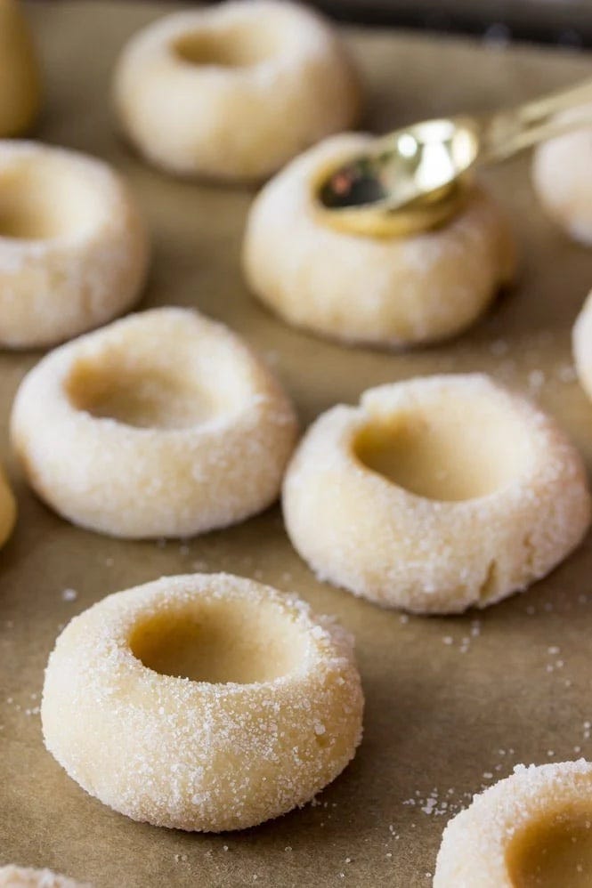 Note: If you go the curd route, you’ll have to put it in after the cookies have cooled. To make sure the thumbprint doesn’t disappear after baking, immediately upon removing the cookies from the oven, use a teaspoon to create a re-deepened “thumbprint” divot.