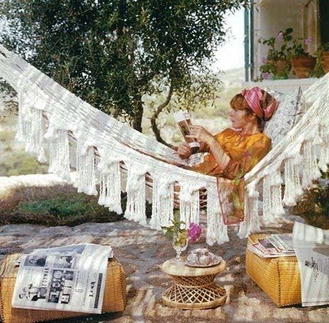 Bettina Graziani relaxes in a hammock on the Costa Smeralda, Sardinia, 1964 by Slim Aarons